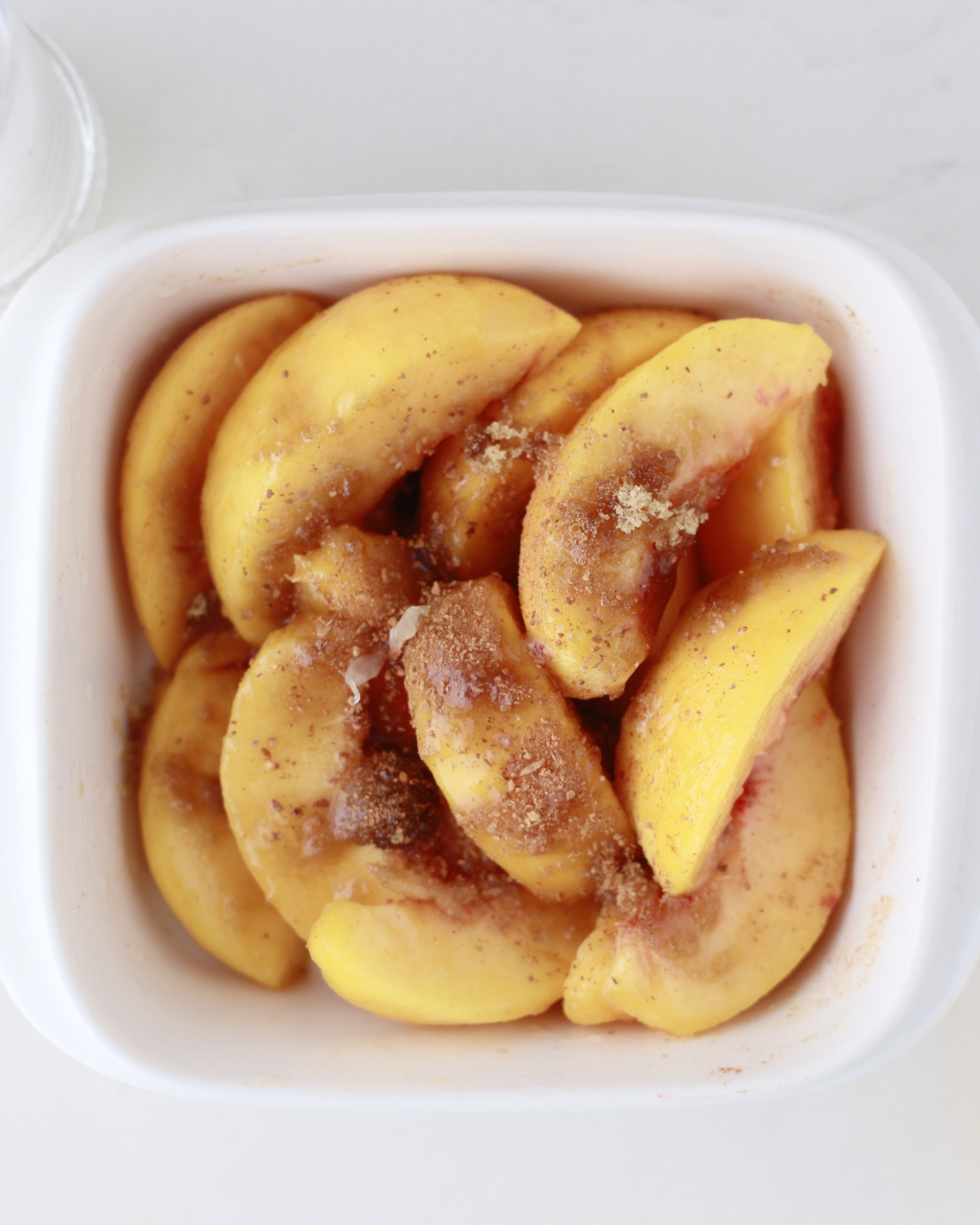 Toss the sliced peaches with lemon juice, sugar, cinnamon, and salt