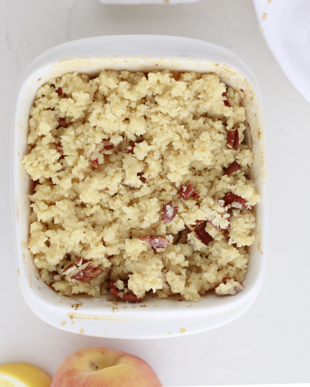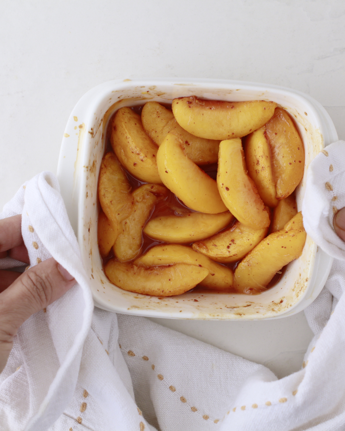 Spread the prepared peach mixture into a greased baking dish and bake for 5-7 minutes